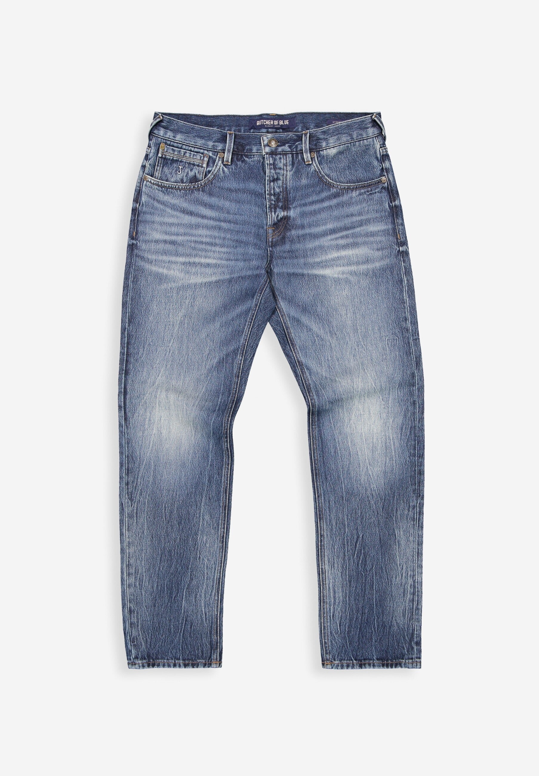 Uitgevoerd als klassieke 5-pocket jeans met stevige details zoals rivets en knopen in een matte staalafwerking. De subtiele branding zie je terug in de afwerking, zoals het stiksel op de zakken.